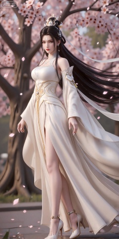 她穿着一件乳白色的汉服,衣服上有着精美的花纹和金线,分离式的袖子,宽袖,赤肩,肩膀上披着飘带,修长的双腿穿着一双镶嵌着一颗珍珠的高跟鞋,她站在地上,风吹动她的头发和衣服,花瓣在空中飞舞,画面非常唯美。背景是一颗巨大的桃花树。
