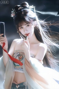 可爱女学生,真人,皮肤雪白雪白俏皮可爱的动作,慵懒。另一只手拿着的口红在给自己涂口红,一只手拿着小镜子红色丝带飘扬. 对焦模糊,强侧光,高曝,过曝,暗调,伦勃朗光,中式花妖,古典美人,以桃花为鬓,长发,云鬓,情绪氛围感拉满,胶片颗粒感,慢快门,朦胧美学, 服饰材质柔软,飘逸,神性,楚辞神女,流苏发饰,步摇,衣袂飘飘,披帛,头饰,黄金比例的五官,明艳五官秀发飞扬飘舞、身着盛装的女生,抓拍她曼妙的全身姿态,尽显动态美学。画面存在失焦的残影,斑驳光影和隐约场景暗朦光朦地交织,部分区域过曝, 扎着双马尾,吊着各种发饰,高贵冷艳,古代刁蛮大小姐,公主切发型,马尾上面带着中式精致繁琐配饰,发簪,穿着中式无袖露肩上衣,衣服上有花纹勾画精致,非常潮流的搭配风格,逆光拍摄,柔和的光影勾勒人物轮廓,低角度仰拍构图,营造静谧松弛感。 ,日常快照风格,自然柔和光线。可爱的表情,鬓角发丝凌乱自然垂落,随机动态视角,摆pose。 人像摄影,日常快照风格,美女,精致发饰,锁骨很好看,肚脐,微距镜头,超细节,冷白匀净清透细腻的皮肤,完美身材,半身镜头,