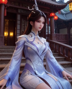 (oriental architecture, elegant decor, sophisticated style:1.1),(Sitting on a staircase, head tilted, looking playful and mischievous,:1.1),(breasts:1.2),<lora:XL宗门卧底沧月公主:0.95>,miss cangyue,blue white dress,double sleeve,lace bra,blue eyes,white foil under the left eye,eyeshadow,forehead mark,hair ornament,hair bun,long hair,earrings,pelvic curtain,, score_9,score_8_up,score_7_up,score_6_up,score_5_up,score_4_up,3d rendering,tag1,tag2, Cinematic Lighting,backlighting,