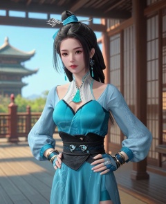 (oriental architecture, elegant decor, sophisticated style:1.1),(standing with hands on hips:1.1),(breasts:1.2),<lora:XLCG师兄蓝灵娥:0.95>,miss lanlinge,blue dress,brown eyes,black hair,low-tied long hair,hair ornament,hair bun,sash,puffy sleeves,fingerless gloves,earrings,jewelry,, score_9,score_8_up,score_7_up,score_6_up,score_5_up,score_4_up,3d rendering,tag1,tag2, Cinematic Lighting,backlighting,
