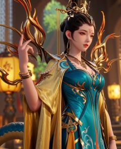 (oriental architecture, elegant decor, sophisticated style:1.1),(villain pose:1.1),(breasts:1.2),<lora:XL师兄啊女娲圣人:0.95>,miss nuwa,snake tail,jewelry,earrings,forehead mark,bracelet,chinese clothes,blue dress,shawl sleeves,brown eyes,hair bun,necklace,, score_9,score_8_up,score_7_up,score_6_up,score_5_up,score_4_up,3d rendering,tag1,tag2, Cinematic Lighting,backlighting,