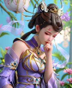 (oriental architecture, elegant decor, sophisticated style:1.1),(Standing in a garden, smelling a flower, with closed eyes, enjoying the fragrance,:1.1),(breasts:1.2),<lora:XL师兄啊狐狸精小兰:0.95>,miss xiaolan,purple tight dress,forehead butterfly mark,mole under right eye,black hair,twintails,hair bun,blue eyes,bare shoulders,earrings,jewelry,hair ornament,blue gemstone,detached sleeves,shawl,, score_9,score_8_up,score_7_up,score_6_up,score_5_up,score_4_up,3d rendering,tag1,tag2, Cinematic Lighting,backlighting,