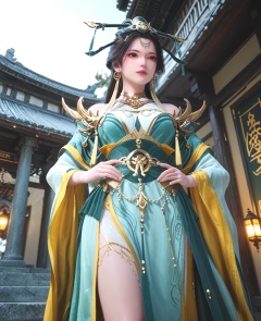 (oriental architecture, elegant decor, sophisticated style:1.1),(With hips tilted to one side, hands resting just below her waist, she showcases a coy allure that's hard to resist:1.1),(breasts:1.2),<lora:XL师兄啊王母娘娘:0.95>,empress,aque dress paired with a green tight corset,black hair,long hair,hair bun,hair ornament,tassel earrings,jewelry,tassel,double cuffs,choker,bare shoulders,see-through decorative chiffon,black eyes,, score_9,score_8_up,score_7_up,score_6_up,score_5_up,score_4_up,3d rendering,tag1,tag2, Cinematic Lighting,backlighting,