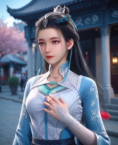 (oriental architecture, elegant decor, sophisticated style:1.1),(With one hand touching her chin, eyes gazing into the distance, she emanates contemplation and wonderment:1.1),(breasts:1.2),<lora:XL师兄啊皖江雨:0.95>,miss wanjiangyu,blue paired with white dress,black hair,long hair,hair bun,hair ornament,jewelry,necklace,black sash,opera length gloves,ribbon,grey eyes,, score_9,score_8_up,score_7_up,score_6_up,score_5_up,score_4_up,3d rendering,tag1,tag2, Cinematic Lighting,backlighting,