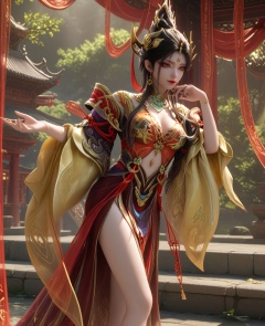 (oriental architecture, elegant decor, sophisticated style:1.1),(Balancing on a narrow ledge or wall, looking fearless and adventurous,:1.1),(breasts:1.2),<lora:永劫无间南宫锦五丰太岁:0.95>,miss nangongjin,orange red corset dress with plum,yellow eyes,eyeshadow,forehead mark,black hair,traditional chinese updo with long front strands,hair ornament,earrings,jewelry,claw ring,wide flowing sleeves,cleavage,high heels,, score_9,score_8_up,score_7_up,score_6_up,score_5_up,score_4_up,3d rendering,tag1,tag2, Cinematic Lighting,backlighting,