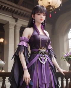 (oriental architecture, elegant decor, sophisticated style:1.1),(Cleaning:1.1),(breasts:1.2),<lora:XL修罗武神大蛋蛋:0.95>,miss dandan,black dress,belt,purple frills,bare shoulders,black hair,bangs,long hair,earrings,detached sleeves,feather trim,pelvic curtain,feathers fart curtain with purple petticoat underneath,bracelet,, score_9,score_8_up,score_7_up,score_6_up,score_5_up,score_4_up,3d rendering,tag1,tag2, Cinematic Lighting,backlighting,
