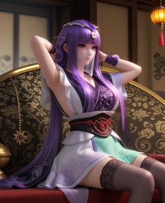 (oriental architecture, elegant decor, sophisticated style:1.1),(Hands clasped behind the head, reclining,:1.1),(breasts:1.2),<lora:XL16秦时明月少司命:0.95>,priestess of birth,short dress,veil,purple eyes,purple hair,long hair,hime cut,hair ornament,back-crossing sash,thighhighs,wristband,bell,, score_9,score_8_up,score_7_up,score_6_up,score_5_up,score_4_up,3d rendering,tag1,tag2, Cinematic Lighting,backlighting,