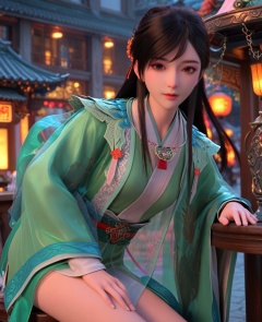 (oriental architecture, elegant decor, sophisticated style:1.1),(Sitting on a stool, leaning forward with elbows on knees,:1.1),(breasts:1.2),<lora:XL少年歌行叶若依:0.95>,miss yeruoyi,green dress,see-through robe,necklace,black hair,long hair,gray eyes,hair ornament,floral print,bangs,sash,hair bun,lips,, score_9,score_8_up,score_7_up,score_6_up,score_5_up,score_4_up,3d rendering,tag1,tag2, Cinematic Lighting,backlighting,