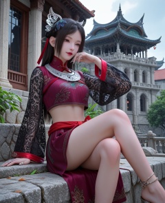 (oriental architecture, elegant decor, sophisticated style:1.1),(Resting against a rock or wall, one leg bent, gazing into the distance with a sense of purpose,:1.1),(breasts:1.2),<lora:XL少年歌行慕雨墨:0.95>,miss muyvmo,red crop top,pleated skirt,black hair,hair ornament,long hair,silver collar,black lace long sleeves,claw ring,heterochromatic eyes,lips,midriff,, score_9,score_8_up,score_7_up,score_6_up,score_5_up,score_4_up,3d rendering,tag1,tag2, Cinematic Lighting,backlighting,