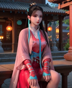 (oriental architecture, elegant decor, sophisticated style:1.1),(hands on knees:1.1),(breasts:1.2),<lora:XL少年歌行尹落霞:0.95>,miss yinluoxia,pink chiffon outerwea with red dress underneath,black hair,long hair,azure hair ribbon,white lingerie collar,brown eyes,hair ornament,blue waist tie,eyeshadow,lips,fingerless gloves,, score_9,score_8_up,score_7_up,score_6_up,score_5_up,score_4_up,3d rendering,tag1,tag2, Cinematic Lighting,backlighting,