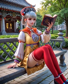 (oriental architecture, elegant decor, sophisticated style:1.1),(Sitting cross-legged on a park bench, holding a book and reading,:1.1),(breasts:1.2),<lora:XL少年白马小白:0.95>,miss xiaobai,yellow short dress,brown detachable collar,puffy long sleeves,brown miniskirt,belt,brown eyes,mole under eye,silver hair,bangs,hat,jewelry,red thighhighs,black shoes,anklet,pom pom \(ornament\),, score_9,score_8_up,score_7_up,score_6_up,score_5_up,score_4_up,3d rendering,tag1,tag2, Cinematic Lighting,backlighting,