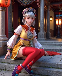 (oriental architecture, elegant decor, sophisticated style:1.1),(resting on a diagonal:1.1),(breasts:1.2),<lora:XL少年白马小白:0.95>,miss xiaobai,yellow short dress,brown detachable collar,puffy long sleeves,brown miniskirt,belt,brown eyes,mole under eye,silver hair,bangs,hat,jewelry,red thighhighs,black shoes,anklet,pom pom \(ornament\),, score_9,score_8_up,score_7_up,score_6_up,score_5_up,score_4_up,3d rendering,tag1,tag2, Cinematic Lighting,backlighting,
