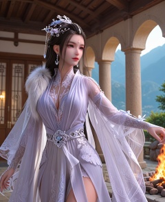 (oriental architecture, elegant decor, sophisticated style:1.1),(dancing at a campfire party:1.1),(breasts:1.2),<lora:XL少白醉春风玥瑶:0.8>,miss yueyao,chiffon dress layered on top of slit peplos,black hair,long hair,hair ornament,hair bun,hair flower,crescent earrings,jewelry,shoulder pearl chain,left shoulder fur trim,left shoulder shawl,sash,forehead jewel,beads under eye,lace opera length gloves,, score_9,score_8_up,score_7_up,score_6_up,score_5_up,score_4_up,3d rendering,tag1,tag2, Cinematic Lighting,backlighting,
