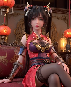 (oriental architecture, elegant decor, sophisticated style:1.1),(Sitting on the edge of a chair:1.1),(breasts:1.2),<lora:XL神墓楚钰黑丝:0.95>,miss chuyu,red outer robe,purple minidress,sash,green eyes,black hair,twintails,long hair,black thighhighs,bangs,earrings,jewelry,vambraces,bracer,, score_9,score_8_up,score_7_up,score_6_up,score_5_up,score_4_up,3d rendering,tag1,tag2, Cinematic Lighting,backlighting,