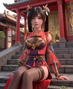 (oriental architecture, elegant decor, sophisticated style:1.1),(Sitting on a step, gazing downward:1.1),(breasts:1.2),<lora:XL神墓楚钰黑丝:0.95>,miss chuyu,red outer robe,purple minidress,sash,green eyes,black hair,twintails,long hair,black thighhighs,bangs,earrings,jewelry,vambraces,bracer,, score_9,score_8_up,score_7_up,score_6_up,score_5_up,score_4_up,3d rendering,tag1,tag2, Cinematic Lighting,backlighting,