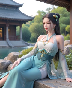 (oriental architecture, elegant decor, sophisticated style:1.1),(Sitting on a rock or boulder, looking peaceful:1.1),(breasts:1.2),<lora:XL雪鹰领主卓依:0.8>,miss zhuoyi,blue gradient white dress,white corset,black hair,long hair,detached sleeves,hair ornament,jewelry,hair bun,see-through sleeves,green eyes,black belt,red eyelashes,, score_9,score_8_up,score_7_up,score_6_up,score_5_up,score_4_up,3d rendering,tag1,tag2, Cinematic Lighting,backlighting,