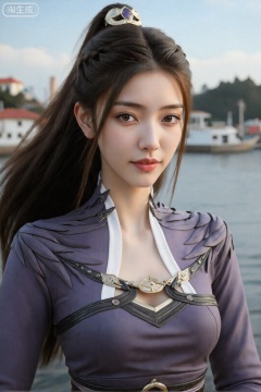 这是一幅非常细致、逼真的CGI 肖像,描绘的是一位东亚女性,皮肤白皙,深棕色长发扎成高马尾辫,并佩戴紫色和金色发饰。她有一双杏仁形的棕色大眼睛和微妙而自信的微笑。她穿着一件带有金色和黑色装饰的紫色中世纪风格连衣裙,包括高领、肩部褶边和带有金色扣环的装饰胸件。背景是模糊、宁静的海滨场景,蓝天下的建筑物和山地景观。该图像具有柔和、自然的光线,