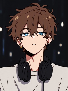 <lora:动漫头122:0.8>,anime style,rain,a young male with brown hair and blue eyes. He has short hair that is slightly disheveled but looks stylish. His eyes appear deep and contemplative. He seems to be in his teens or early twenties,with a medium build,wearing a white top and a pair of black over-ear headphones around his neck. Overall,his expression is somewhat serious,giving him an introverted vibe. The background is blurred,but it can be seen that there are some dark-toned elements,possibly indoor lighting or other objects.,