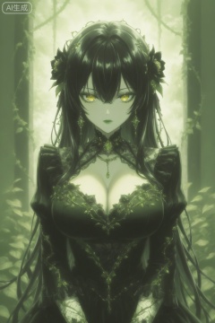 darkaesthetic_style,1girl, solo, long hair, breasts, looking at viewer, bangs, large breasts, black hair, hair ornament, long sleeves, dress, cleavage, hair between eyes, jewelry, closed mouth, yellow eyes, flower, earrings, hair flower, black dress, makeup, plant, lipstick, vines, green theme