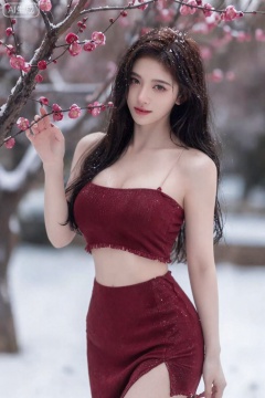 8K 高清去AI 感美女照片,中式梅花妖,改良性感古装(酒红色吊带露腰+ 毛边开叉裙,露长腿),完美身材(巨大胸+ 蜂腰),皮肤雪白光滑水润,妖艳妩媚凝眸直视镜头,雪地梅园里站立,手捧梅花枝,70-200mm 镜头f/2.8,背景虚化,美颜轻透,发丝带雪粒,衣料质感厚重有光泽,梅花花瓣纹理清晰,眼神冷艳妩媚。​