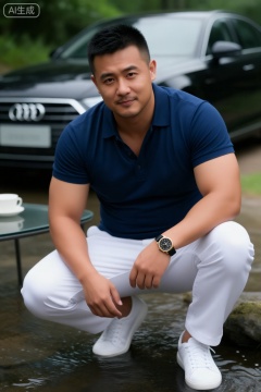 一名男子留着黑色短发,中等身材,身穿深蓝色纽扣衬衫。他坐在光线柔和的房间里的一张玻璃顶桌子旁,男人表情平淡,浅浅的笑意,肌肉虽被脂肪包裹却紧实有力,肌肉线条分明。左腕佩戴着黑色表盘与金色表框的腕表,身着白色休闲裤与白色运动鞋。他正蹲在溪水中嬉戏,身后停着一辆黑色奥迪车,四周环绕着郁郁葱葱的绿植。