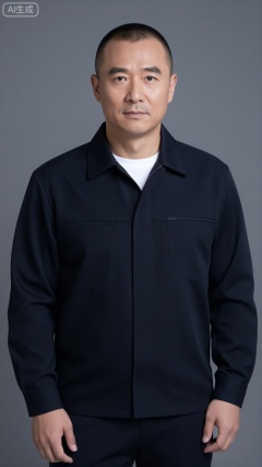 DYWH, a 30-year-old middle-aged man with short hair, well-defined facial features, three-dimensional eyebrows, firm and sharp eyes, clear and angular jawline, a masculine and tough temperament, and a calm aura; wearing a black simple work jacket/white cotton bottoming shirt, with straight shoulder lines and an elegant posture Upright (standing straight and not stiff, hands hanging naturally or in pockets); the background is an industrial style solid color background (dark gray/cement color), side light outlines muscle lines and facial contours, high contrast, delicate texture, 8K high definition, full of details (stubble texture, clothing folds are clearly visible)