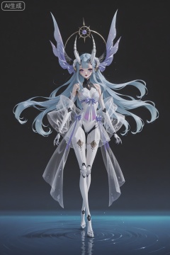 hairpins and buns,bare shoulders,red lips,purple eye shadow,solo,no humans,solo,science fiction,claws,horns,monster,armor,art_5star,asian inspire,1girl,very long hair,floating hair,blue hair,Whimsical,ethereal,fantasy anime girl with flowing hair and sea-themed accessories,gentle jellyfish companions,serene underwater ambiance,delicate watercolor artistry,dreamlike aesthetic.,bare feet,full body,