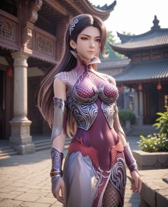 (oriental architecture, elegant decor, sophisticated style:1.1),(camping:1.1),(breasts:1.2), <lora:XL16秦时明月惊鲵:0.95> miss jingni, corset dress with purple topwear and silver skirt, brown eyes, black hair, long hair, detached sleeves, barrettes, black leather left shoulder cut and mesh fabric on right shoulder, side slit, fishnet pantyhose, score_9,score_8_up,score_7_up,score_6_up,score_5_up,score_4_up,3d rendering,tag1,tag2, Cinematic Lighting,backlighting,