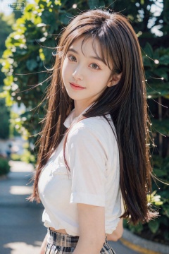 真人摄影,一位清纯的初恋学妹女友,在清晨的林荫道上回眸微笑,阳光透过树叶形成斑驳的光影,洒在她柔顺的长发和白皙的脸庞上,她穿着干净的白色衬衫和格纹短裙,眼神清澈充满活力,背景是模糊的绿色植物,突出人物主体,精致的壁纸风格,absurdres,细节锐利,皮肤纹理细腻,发丝分明,