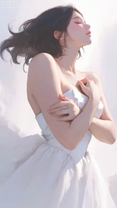 1girl, solo, alternate costume, breasts, dress, bare shoulders, closed eyes, hugging herself, arms crossed over chest, self-embrace, white dress, strapless, floating hair, strapless dress,anime aesthetic,