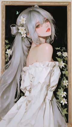 1girl, solo, long hair, looking at viewer, bangs, hair ornament, dress, ribbon, hair between eyes, bare shoulders, twintails, very long hair, green eyes, flower, grey hair, cowboy shot, parted lips, hair flower, off shoulder, white dress, from side, bug, white flower, butterfly, hair rings, off-shoulder dress