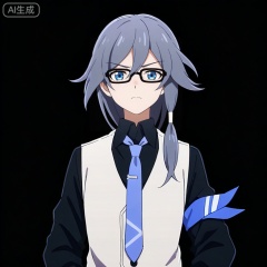 looking at viewer,anime_style,fu_hua,blue eyes,grey hair,hair ornament,hair between eyes,blue armband,white vest,collared shirt,black pants,black footwear,black shirt,white belt,black-framed eyewear,blue necktie,necktie,eyebrows visible through hair,glasses,black gloves,bespectacled