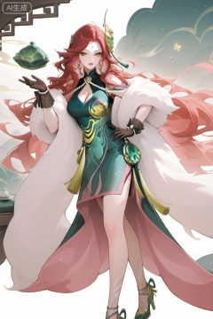1girl,standing,white background,hand on hip,elbow rest,fmly,solo,red-pink long hair,green eyes,eyeshadow,long hair,makeup,facial mark,forehead mark,jewelry,earrings,hair ornament,breasts,cleavage,dress,green dress,china dress,clothing cutout,cleavage cutout,white fur shawl,waist pendant,tassel,see-through ribbon,black gloves,see-through gloves,bow gloves,pearl bracelet,pearl,ornate high heels,gold trim high heels,foot decoration,bare legs,
