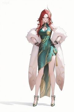 1girl,standing,white background,hands on hip,separated legs,fmly,solo,red-pink long hair,green eyes,eyeshadow,long hair,makeup,facial mark,forehead mark,jewelry,earrings,hair ornament,breasts,cleavage,dress,green dress,china dress,clothing cutout,cleavage cutout,white fur shawl,waist pendant,tassel,see-through ribbon,black gloves,see-through gloves,bow gloves,pearl bracelet,pearl,ornate high heels,gold trim high heels,foot decoration,bare legs,