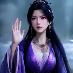 guoman,masterpiece,best quality,cinematic,detail eyes,(realistic:2),(ultra-detailed),perfect composition,intricate details,absurdres,detailed face,high quality,high res,8K,1girl,long hair,black hair,hair ornament,long sleeves,dress,jewelry,earrings,parted lips,necklace,chinese clothes,purple dress,