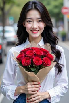 A photograph of a young Asian woman with fair skin and long, wavy black hair. She is wearing a white long-sleeved button-down shirt and blue pleated skirt. She holds a bouquet of vibrant red rose wrapped in a beige burlap cloth with frayed edges. The background in street, The woman's expression is smirk,