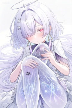 Create a detailed illustration of a 1 girl with white, flowing hair reaching her waist and striking red eyes. She wears a hairclip and has a halo around her head, giving her an ethereal appearance. Her ears are adorned with elegant earrings. The girl’s legs are depicted in a transparent thigh style, revealing the intricate crystal patterns on her skin. A subtle black tacet mark is placed on her thigh, adding a touch of mystery. The overall aesthetic should have a fairy-like quality, with soft, glowing lighting and a serene, magical atmosphere.