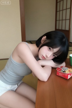一位东亚女性,皮肤苍白,头发黑,波波头,身穿灰色蕾丝边背心,露出一丝乳沟,下身穿着白色短裤。她靠在木桌上,头枕在左臂上,直视着镜头,表情略显撅嘴。在她右边的桌子上,有一包红色的方便面和一个绿色的杯子。背景是一间传统的日式房间,配有米色墙壁、榻榻米地板和带玻璃板的木制推拉门。光线自然,突出了她精致的五官和宁静的家庭环境。