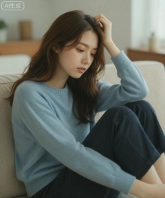 图片显示一名年轻女子,留着棕色长发,穿着浅蓝色毛衣和深色裤子。她坐在沙发上,一只手放在头上,另一只手臂弯曲,看上去很放松​​。背景柔和模糊,暗示着舒适的室内环境,可能是客厅。灯光温暖自然,营造出宁静祥和的氛围。