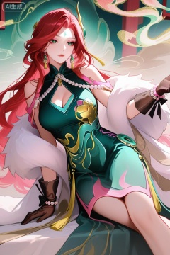 fmly ,1girl,solo,red-pink long hair,green eyes,eyeshadow,long hair,forehead mark,jewelry,earrings,hair ornament,breasts,cleavage,green dress,chinese clothes,clothing cutout,cleavage cutout,white fur shawl,waist pendant,tassel,see-through ribbon,black gloves,see-through gloves,bow gloves,pearl bracelet,pearl,gold trim high heels,Jade high heels,leg decoration