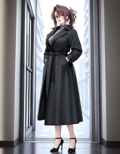 masterpiece,best quality,amazing quality,very aesthetic,high resolution,ultra detailed,perfect details,1girl,solo,<lora:mai_nimigoto_t1:1>,mai_nimigoto_t1,brown_hair,glasses,lipstick,brown_eyes,ponytail,(aged up,:3),full body,coat,