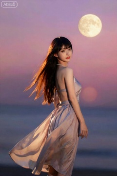 一位长发飘飘的活力女孩,在日落时分的海边。她穿着飘逸的吊带长裙,。她回头望向镜头,夕阳的余晖为她勾勒出金色的轮廓,。背景是粉紫色渐变的天空,整个画面充满电影感和治愈感。
