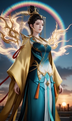 <lora:师兄-女娲IL买断:0.8>,1girl,long,black hair,updo,golden headdress,teal-colored dress,plunging neckline and gold embellishments,yellow,golden,cape-like garment,flowing skirt,wing-like accessories,gold jewelry,necklace,bracelets,orange tassels,wings,, score_9,score_8_up,score_7_up,source_anime,night,dark environment,Blend swirling,whirlpool-like patterns of intense and contrasting colors,with spiraling motions and chaotic color interactions,highly detailed,ultra-high resolution,32K UHD,sharp focus,best-quality,masterpiece,Emotionalization,golden hour,unconventional supreme masterpiece,masterful details,temperate atmosphere,with a high-end texture,in the style of fashion photography,Dynamic Angle,Dynamic posture,
