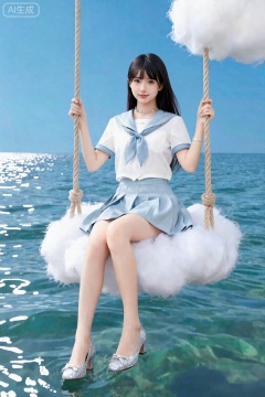 图像中,一位年轻女子坐在由蓬松的白云组成的秋千上,秋千悬浮在一片波浪柔和的海洋上。她穿着浅蓝色和白色水手风格的服装:蓝色领子的短袖上衣,搭配配套的领带,搭配百褶裙。,。她双腿交叉,穿着闪亮的银色钻石高跟鞋,上面有华丽的装饰细节。背景展示了清澈的蓝天和平静的青色海水,阳光从水面反射。秋千由粗大的棕色绳子固定,整体场景明亮,强调服装、云彩和自然环境的鲜艳色彩。,月月