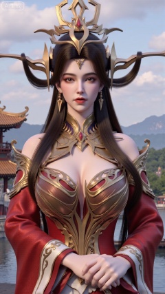 (masterpiece, best quality:1.2),1 girl, solo, long hair, black hair, hair accessories, clothing, cleavage cuts, long dress, jewelry, upper body, earrings. Background is outdoor, sky, clouds, water, trees, architecture, landscape, lantern, mountain, dragon, architecture, bridge, east Asian architecture, fog, pagoda,,(huge breasts:2.99),(full breasts:2.99),,Xbigbreasts,XbaifengsongyuYH,XliuyuYH2,XanmyXM,XxuanyYH,XruotianzhuqueG,XxuanyiYH,XPolaroidFilmStyle