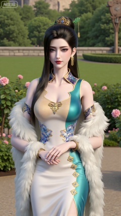 (masterpiece:1.2),best quality,,A woman adorned in traditional Chinese attire,( long dress,black long hair),featuring a flowing robe with intricate embroidery and floral accents. A garden filled with pink roses and lush greenery. Soft pastel hues of white,blue,and green,creating a serene atmosphere. Photorealistic photography.,(huge breasts:2.99),(full breasts:2.99),, ,