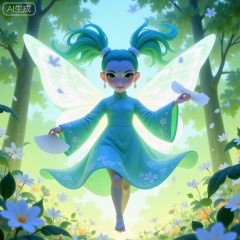 A digital artwork depicting a lively, enchanting figure of a girl with a cyan glow of skin, twin ponytails of mint green hair and butterfly-shaped transparent wings. Dressed in flowy cyan cheongsam with flower patterns, this image has a cheerful expression, feet hovering above the ground, hands waving a feather fan. The bright rotating colors of green, yellow and white form a forest background. Its style has a fantasy theme. The whole character is surrounded by cyan dewdrops. There is a lively atmosphere. The air is dotted with fluttering petal particles. It is high-definition, dreamy and ethereal.
