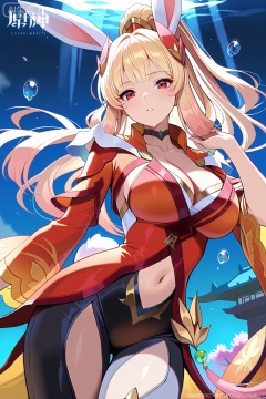 公孙离,masterpiece,best quality,official art,extremely detailed CG unity 8k wallpaper,1girl, solo, long hair, breasts, looking at viewer, bangs, blonde hair, large breasts, red eyes, long sleeves, navel, animal ears, cleavage, collarbone, tail, ponytail, thighs,  choker, pants, stomach, rabbit ears,  clothing cutout, black choker, black pants, high ponytail, rabbit tail, navel cutout