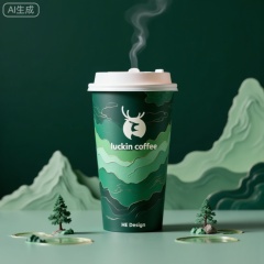 Luckin Coffee’s limited-edition paper cup design is displayed. The main body is a green three-dimensional mountain pattern paper cup. The cup body adopts multi-layer gradient green relief technology to simulate the shape of stacked mountains, with the white deer head brand logo and the "luckin coffee" English logo embedded in the middle. The top of the paper cup has a white steam effect rising, and the bottom is decorated with a dark green wavy base. The background is a gradient dark green, surrounded by freehand mountain silhouettes on both sides, and miniature tree models are dotted in the reflection of the water at the bottom. The overall design combines Chinese landscape artistic conception with modern packaging. The colors are dark green, light green, and emerald green to create a sense of hierarchy. The light slants from the top to form a contrast between light and dark, highlighting the three-dimensional texture of the cup body. The words "HE Design" are marked at the bottom of the screen, presenting a natural and fresh visual image of high-end drinks as a whole.