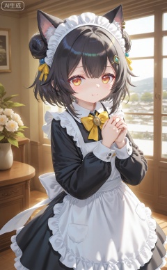 1girl, stud earrings, solo, jewelry, mole, apron, earrings, mole under eye, smile, indoors, white apron, bow, yellow bow, maid, yellow eyes, dutch angle, long sleeves, hair ornament, maid apron, closed mouth, yellow bowtie, frills, hands up, black hair, frilled apron, bowtie, looking at viewer, maid headdress, dress, blush, hairclip, short hair, own hands together, hair bun, hair between eyes, back bow, eyelashes, shirt, white headwear, standing, fingernails, brooch, hat, white bow, open hands, ribbon, ear piercing, black dress